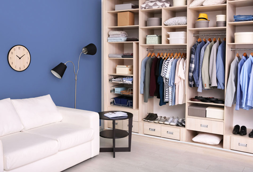 Garderoba nie jest rozwiązaniem jedynie dla dużych domów. W mieszkaniach o małej powierzchni odnajduje się równie dobrze, nawet w kawalerkach, gdzie jak wiadomo jest mało miejsca i przechowywanie rzeczy wymaga naprawdę dobrej koncepcji. Otwarta garderoba, będąca zabudową jednej ze ścian staje się wtedy oryginalnym elementem aranżacji pokoju, który pełni wiele funkcji. Jaki kolor ścian do pokoju z taką garderobą? Ciekawym pomysłem jest pomalowanie ich farbą w ulubionym kolorze ubrań. W naszej aranżacji błękitne koszule korespondują z odcieniem ścian pomalowanych farbą Śnieżka Barwy Natury 164 Chabrowa Polana.