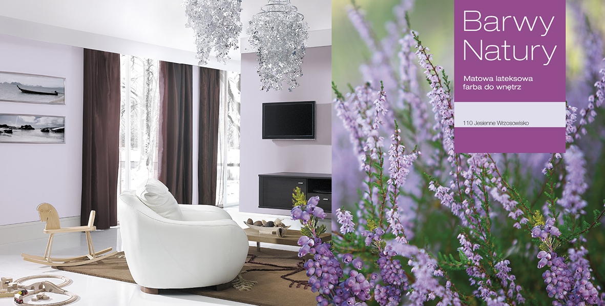 We wnętrzach możemy to podkreślić zestawiając kolor "Wrzosowa Dolina" z barwą "Lilia Wodna" - pierwszy zniweluje napięcie, wprowadzając odrobinę balansu, drugi zaś wprawi w dobry nastrój i pomoże nam się zrelaksować.