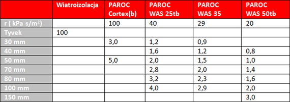 Tabela 3. Wartości właściwej oporności przepływu powietrza RS (kPa s/m2) dla poszczególnych produktów PAROC.