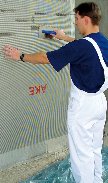Warstwę zbrojoną należy wykonywać w jednej operacji, rozpoczynając od góry ściany. Po nałożeniu zaprawy klejowej Acro-Klej A należy natychmiast bardzo dokładnie wtopić w nią siatkę zbrojącą.
