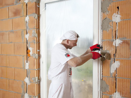 Masę tynkarską narzucamy na ścianę przy użyciu kielni lub maszynowo agregatem tynkarskim, w warstwie ok.15–20 mm. W miejscach narażonych na pęknięcia, jak na przykład przejścia rożnych materiałów w podłożu lub narożniki okien i drzwi, pamiętajmy o zatopieniu siatki zbrojącej. Świeży tynk zaciągamy łatą typu H, wyrównując wstępnie jego powierzchnię. Czynność tą wykonujemy zdecydowanym ruchem, przesuwając przy tym łatę w różnych kierunkach, pamiętając przy tym o kontroli pionu i kątów. Ewentualne ubytki uzupełniamy zaprawą i ponownie zaciągamy. Przy grubości tynku powyżej 25 mm zalecane jest nakładanie wielowarstwowo, metodą „świeże na świeże”, czyli kolejną warstwę nanosimy po wstępnym związaniu poprzedniej. Tak przygotowane powierzchnie pozostawiamy do przeschnięcia” – wyjaśnia ekspert firmy Baumit.