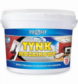 Tynk mozaikowy PROFIT - ziarno 0,8 - 1,2 mm lub 1,2 - 1,6 mm. Dekoracyjny tynk cienkowarstwowy do stosowania wewnątrz i na zewnątrz budynków, jest produkowany w kilkunastu kompozycjach kolorystycznych. Tynk mozaikowy PROFIT służy do wykonywania ozdobnych barwnych wypraw tynkarskich na tradycyjnych tynkach, na podłożach betonowych, gipsowych oraz na płytach wiórowych, gipsowo-kartonowych itp. Spoiwem są tu transparentne żywice, a wypełniaczami kolorowe żwirki kwarcowe o uziarnieniu 0,8-1,2 mm (kolory oznaczone MD), żwirki kwarcowe o uziarnieniu 1,2-1,6 mm ( kolory oznaczone MS). Materiał przeznaczony jest do nakładania i wygładzania metalową pacą. Po związaniu uzyskuje się barwną wyprawę. Właściwości materiału pozwalają mostkować istniejące w podłożu włosowate rysy. Tynk szczególnie zalecany jest do stosowania na wyeksponowanych, narażonych na wycieranie ścianach wewnątrz budynków, np. przy wejściach, na korytarzach, na klatkach schodowych. Na zewnątrz budynków, tynk mozaikowy PROFIT zaleca się stosować na powierzchniach ulegających szybkiemu zabrudzeniu: na cokołach, balustradach, w ościeżach okien i drzwi.