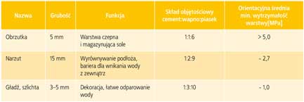 Z punktu widzenia nakładu pracy oraz zużycia materiałów wydawać by się mogło, że tynki cienkowarstwowe mają zdecydowaną przewagę nad wielowarstwowymi. Okazuje się jednak, że w dawnych czasach istniały już możliwości techniczne pozwalające wytwarzać tynki cienkowarstwowe. A jednak ta technologia nie stała się dominującą. Dlaczego? Otóż, po pierwsze, grubą warstwę tynku trudniej jest uszkodzić niż cienką, po drugie w tynkach wielowarstwowych zawarta jest myśl techniczna, która również dzisiaj, z powodzeniem wykorzystywana jest we współczesnych systemach renowacyjnych. Każda z warstw w układzie trójwarstwowym pełni specjalną funkcję (Tabela 1). Wytrzymałość obrzutki powinna być tak dobrana, aby jej wytrzymałość nie przekraczała wytrzymałości podłoża. Wniosek z tego jest taki, że dla materiałów bardziej porowatych, mniej wytrzymałych należy zwiększać ilość wapna w obrzutce, a dla podłoży takich jak beton, ilość wapna może być mniejsza. W okresach letnich należy zwiększyć zawartość wapna w zaprawie, gdyż posiada ono naturalne właściwości utrzymywania wody w zaprawie. Ta jego cecha szczególnie jest przydatna przy pracach w wysokich temperaturach, gdy parowanie wody jest większe niż zazwyczaj. Utrzymanie urabialności zaprawy na odpowiednim poziomie gwarantuje uzyskanie optymalnej przyczepności tynku do podłoża. Do każdej warstwy, zarówno tynków wewnętrznych jak i zewnętrznych zalecana jest inna granulacja piasku. Granulacja piasku odgrywa dużą rolę w wielkości tworzących się kapilar.