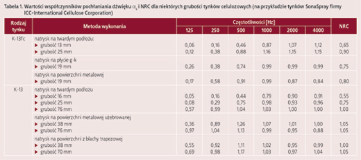 Hala Stulecia jest jedną z ostatnich realizacji, w której zastosowano celulozowy tynk dźwiękochłonny SonaSpray dla poprawy akustyki wnętrza. Został on zastosowany na powierzchniach sufitów poszczególnych cylindrycznych segmentów dachu kopuły hali głównej oraz na czterech absydach na łącznej powierzchni ok. 4000 m2 a grubość warstwy tynku wynosiła 50 mm. Należy zaznaczyć, że kształt kopuły jest z punktu widzenia akustyki najbardziej niekorzystny. Potrzebny więc był materiał o wysokim współczynniku pochłaniania dźwięku. W tabeli 1 przedstawiono wartości współczynników pochłaniania w zależności od grubości materiału.